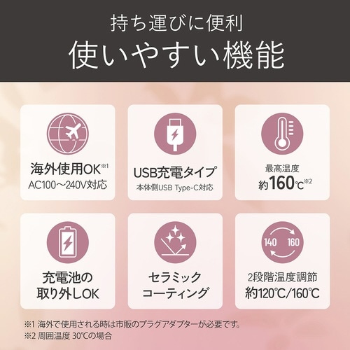 コードレスタイプの2WAYアイロン。USB充電式だから外出先でもサッとカール&ストレート。 |