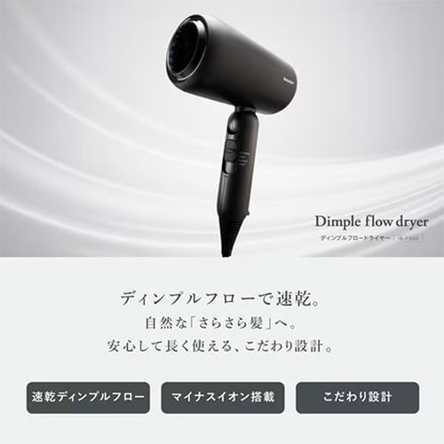 速乾ディンプルフローで自然なさらさら髪へ。マイナスイオンで髪の静電気を抑え、紫外線ダメージから髪を守ります。折りたためるハンドルとフックでコンパクトに収納可能。 |