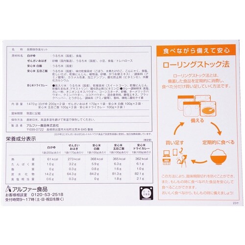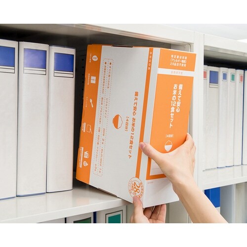 「発災当日+3日分=計4日間(1人)」を想定した、レトルト(白がゆ2食、ぜんざいおはぎ1食)と安心米(白飯、五目ご飯、ドライカレー各3食)のセットです。オフィスなどA4サイズの書棚に収納が可能です。 |
