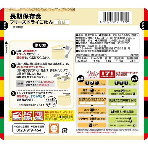 長期保存可能なフリーズドライごはんの白飯です。お湯で3分、水でも5分でできあがります。できあがり量約260gです。 |