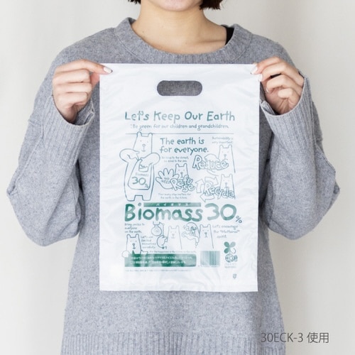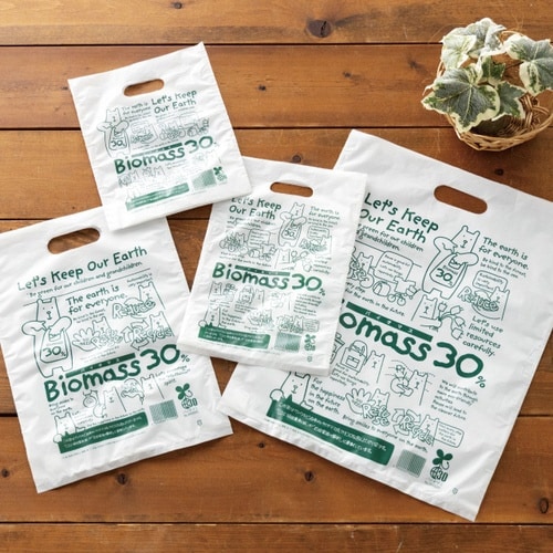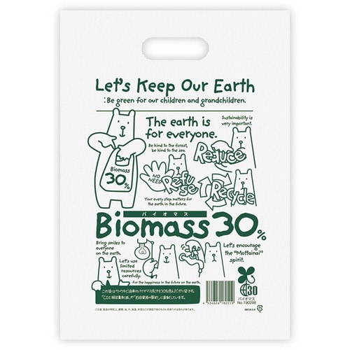 かわいいクマがエコをアピールしている小判抜きの手提げ袋です。素材の一部にさとうきび由来のバイオマス原料を使用していることがわかりやすくデザインされています。 |