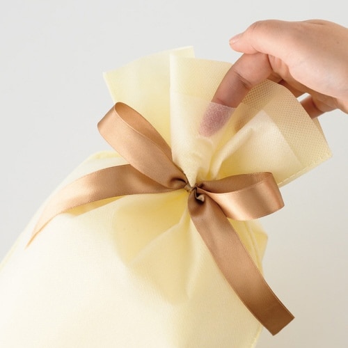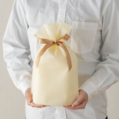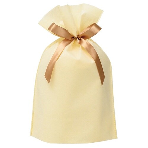やさしいクリーム色の無地のリボン付巾着バッグです。不織布に薄手の不織布を重ねることにより、シンプルながら上品で高級感のあるギフトバッグに仕上げました。リボンを結ぶだけで簡単にラッピングが完成します。 |