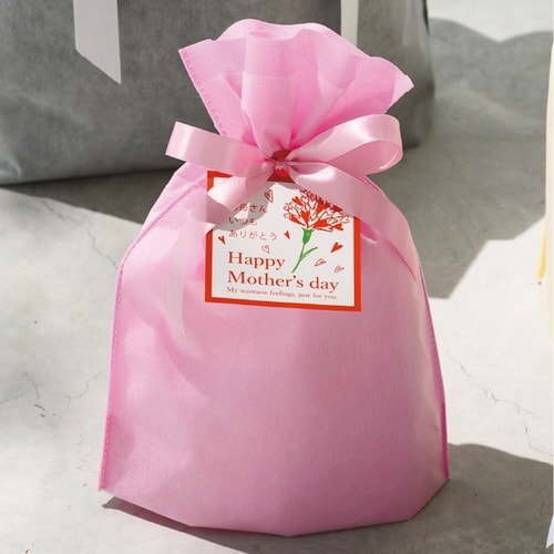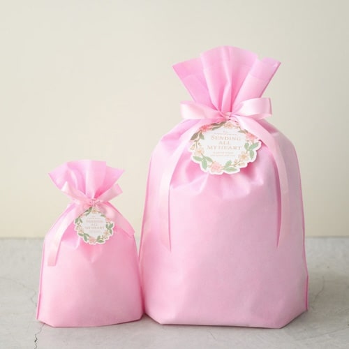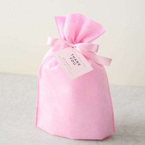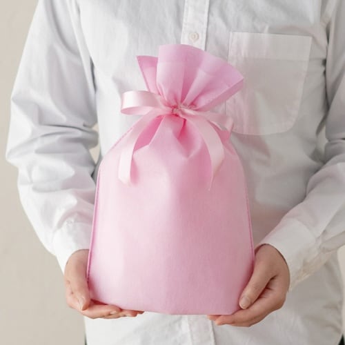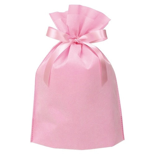 ピンクの無地のリボン付巾着バッグです。不織布に薄手の不織布を重ねることにより、シンプルながら上品で高級感のあるギフトバッグに仕上げました。リボンを結ぶだけで簡単にギフトラッピングが完成します。 |