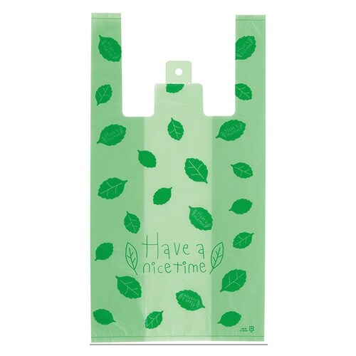 葉っぱが散らばったさわやかなグリーンのレジ袋です。葉っぱにもメッセージが書かれた遊び心のあるデザインです。お花屋さんややパン屋さんなどにオススメです。 |