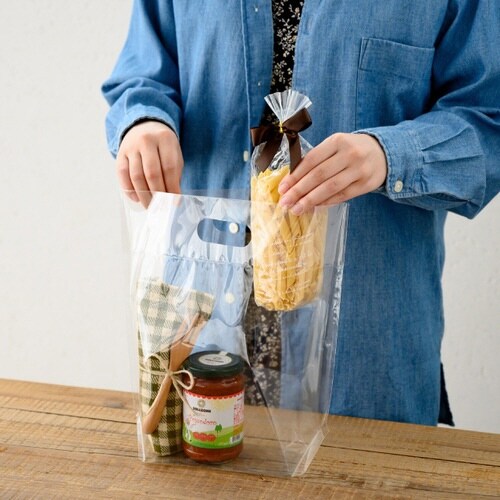 シンプルな透明無地の食品対応のスタンドバッグです。詰め放題や、お徳用セット、お楽しみバッグとしても。シールや掛け紙を使用したアレンジもおすすめです。 |