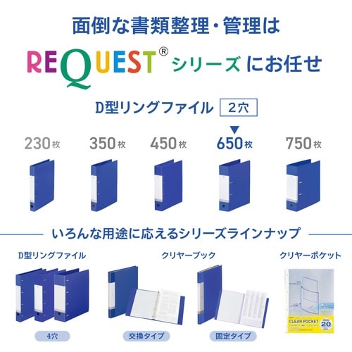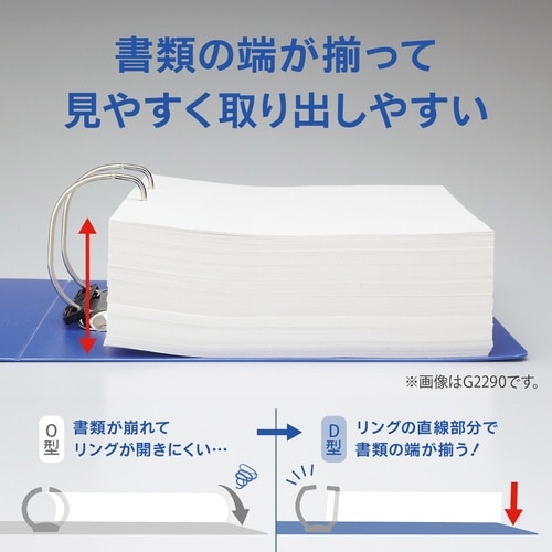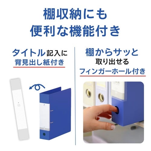 書類の抜き差しがしやすく、書類の端もそろうDリングファイル。表紙の裏側に便利なポケット、棚からスムーズに取り出しができるフィンガーホール付き。両手で開けるリングです。 |