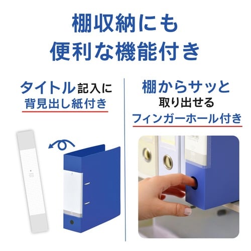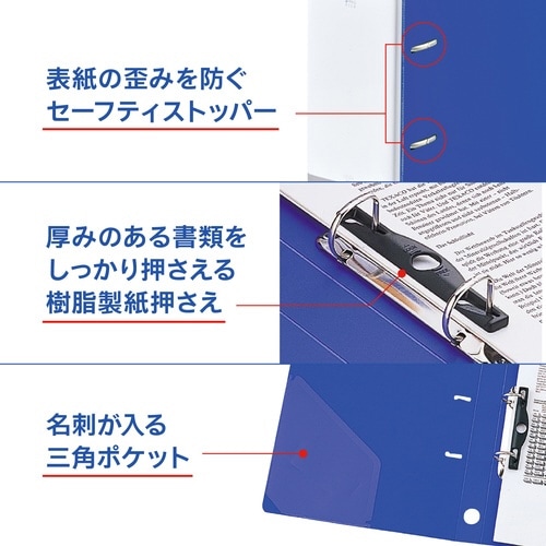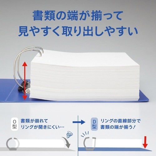 750枚大量収納のD型リングファイル。ファイルのゆがみを防ぐセーフティストッパー付き。書類をしっかり押さえる樹脂製紙押さえ付き。背見出し交換可能タイプ。 |