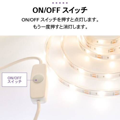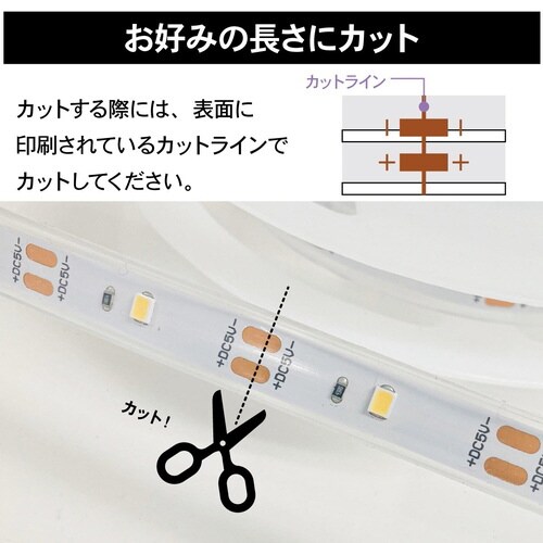 お好みの長さにカットしてご使用できます。付属の両面テープまたはマグネットテープで設置。テープライト長さ3m。USBコード長さ2m。点灯色は白色 |