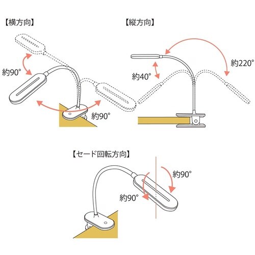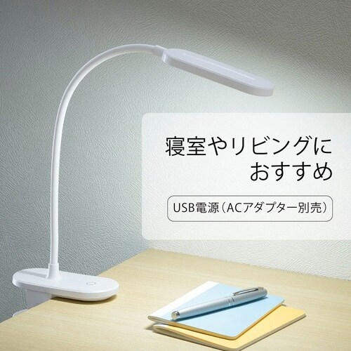 読書や学習におすすめ。スイッチがベースにありON/OFFしやすい。LED一体型。セードの向きが自由に調整できるフレキシブルアーム。USB電源(ACアダプター別売)。屋内用。昼白色 |