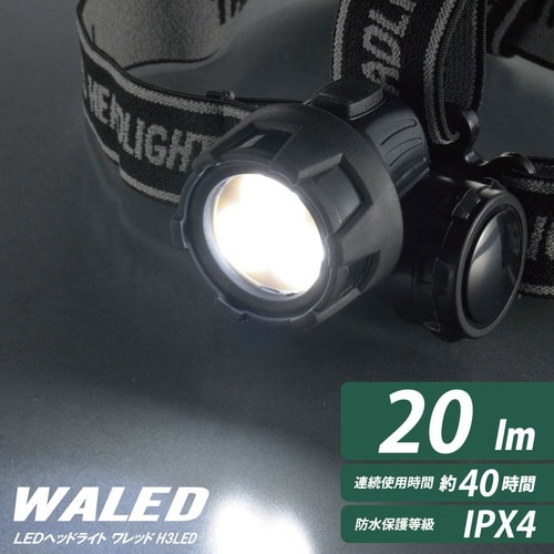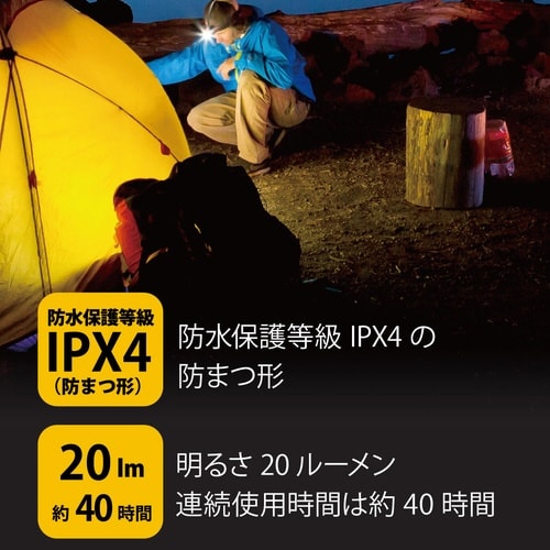 可動ヘッドでライトの角度調整ができます。3点式ヘッドバンドで頭部にしっかり固定。集光レンズでリング照射。明るさ20ルーメン。防水保護等級 IPX4。連続使用時間は約40時間 |