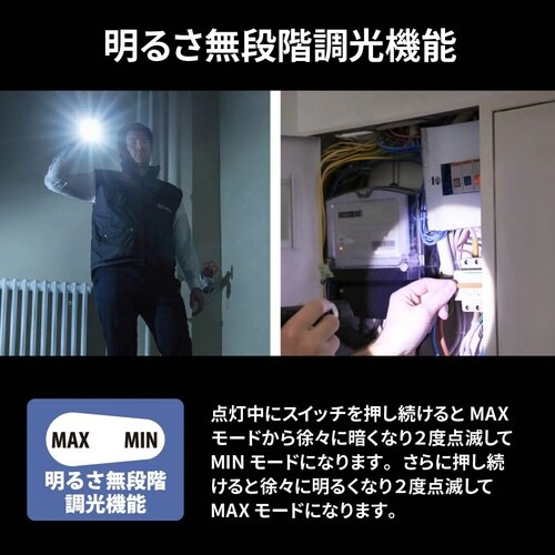 明るさ無段階調光機能。USB充電式(リチウムイオン電池1本付属)。保護等級IPX4。連続使用時間は明るさMAXで約3時間、MINで約7時間。充電インジケーター付き |