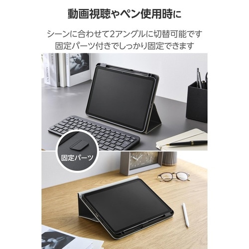 ベルト付きで持ち運びに最適な軽量設計の耐衝撃フラップケースです。動画視聴やタイピングなどシーンに合わせて2アングルにできます。ペンホルダー付き。ビジネスシーンでのご利用にもおすすめです。 |