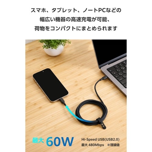 USB Type−C ケーブル 60W 2m PD対応 シリコン&ナイロンメッシュ ブラック