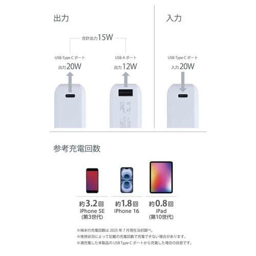 モバイルバッテリー 10000mAh USB−C/USB−A 両面挿し PSE適合 白×黒