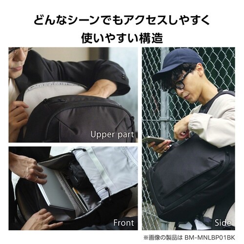 バックパックの最上部やパソコンコンパートメントの上部にポケットを配置することで、デッドスペースになりがちな空間を極限まで活用したMNLシリーズのバックパックです。 |