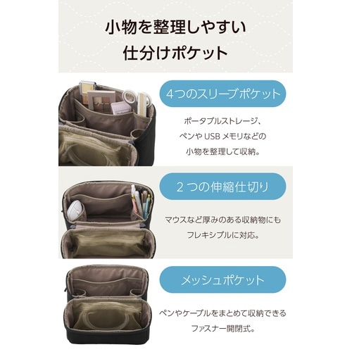 デスク周りの小物やガジェット、筆記用具などのワークツールをまとめてスッキリ収納!たっぷり入る大容量タイプで、デスク上で道具入れとして使える、スタンドタイプのツールポーチです。 |