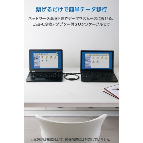 ネットワーク環境不要で、パソコン間のデータ移行がラクラク!パソコン同士を繋げるだけでデータの引っ越しがスムーズにできる、USB Type−C変換アダプター付きリンクケーブルです。 |