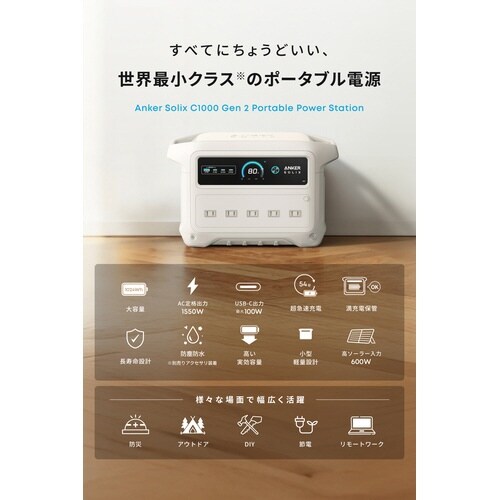 大容量 & 高出力ながらコンパクトな設計のため、防災時はもちろん、キャンプなどのアウトドアシーンや電源が近くにない場所でのデスクワーク、DIYなど様々なシーンで活用いただけます。 |