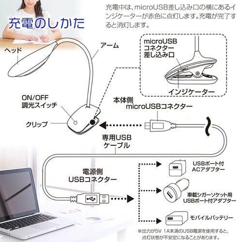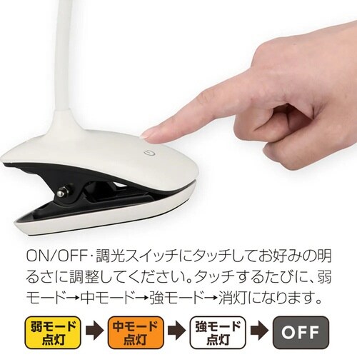 USB充電式でコードレスなので、コンセントがない場所でも使用できます。3段階調光。スイッチがクリップ上にありON/OFFしやすい。ヘッドの向きが自由に調整できるフレキシブルアーム |