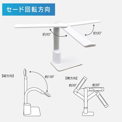 白さが際立つLED色温度で文字がハッキリ。3段階に明るさ調光。JIS規格A形相当の広がる光。全光束約550ルーメン。照度約2500ルクス。本体カラーはホワイト |