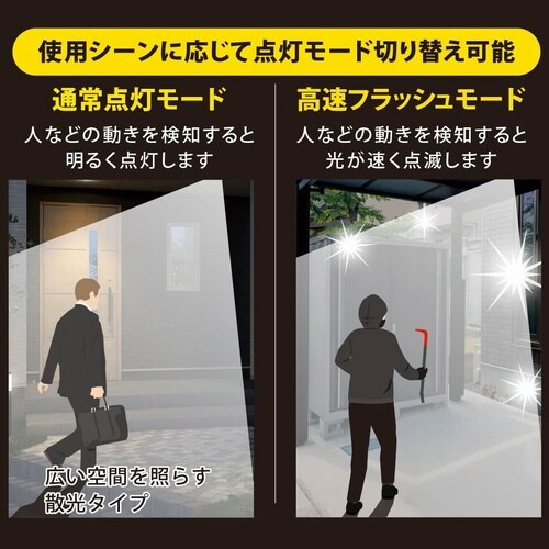 リチウム充電池式で繰り返し使用可能。使用シーンに応じて点灯モード切り替え可能・ 通常点灯モード…人などの動きを検知すると明るく点灯・ 高速フラッシュモード…人などの動きを検知すると光が強く点滅 |