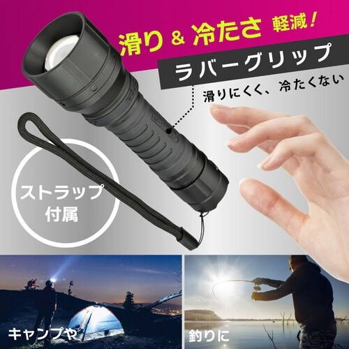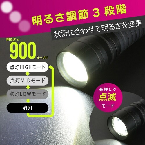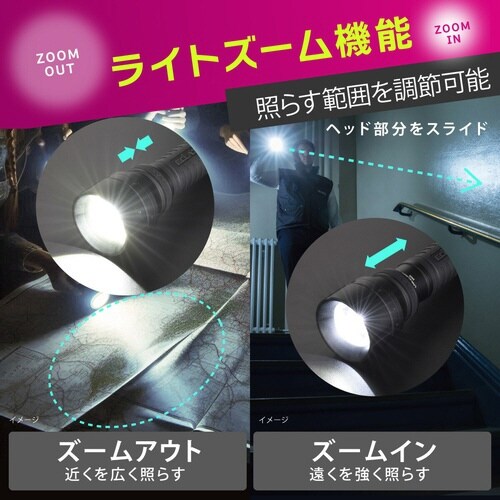 USB充電式で繰り返し使用可能(Type−Cケーブル付属)。ヘッド部分をスライドさせて、遠くを強く、近くを広く照らせるズーム機能付き。明るさ3段階(HIGH/MID/LOW)調光、点滅機能付き |