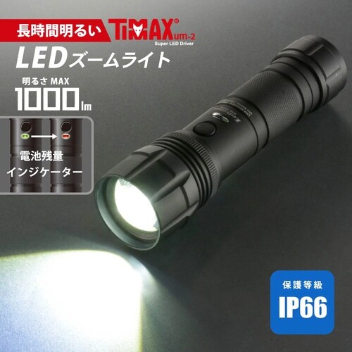 スライドフォーカス機能付き。無段階調光、点滅機能付き。高速/低速と点滅間隔が調整できるアジャストフラッシュモード付き。明るさMAX 1000ルーメン。電池残量インジケーター機能付き |