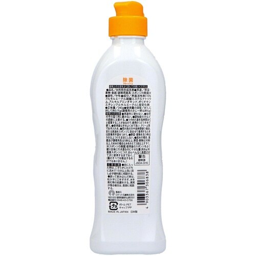 | 注意事項 | ※用途外に使わない。幼児の手の届く所に置かない。使用後は手をよく洗い、クリームなどでお手入れを。荒れ性の方や長時間使う場合、また洗剤をブラシにつけて洗う時は炊事用手袋を使う。洗たく機のフタなどのプラスチック部分に原液がついた時は水でふきとる。放置すると傷むことがある。日の当たる場所等高温になる所に長時間置かない。認知症の方などの誤飲を防ぐため、置き場所に注意する。 |