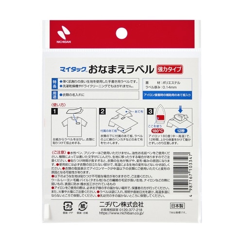 衣類などの布地にアイロンを使って接着することができるラベルです。耐久性に優れ、約151回の洗濯乾燥やドライクリーニングに耐えることができます。業務用の乾燥機にも対応。ラベルは手書き専用です。 |