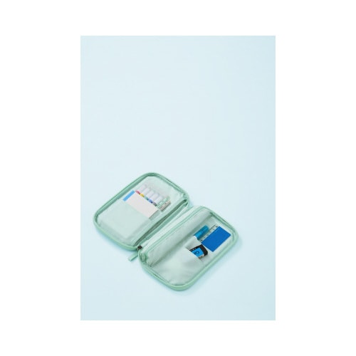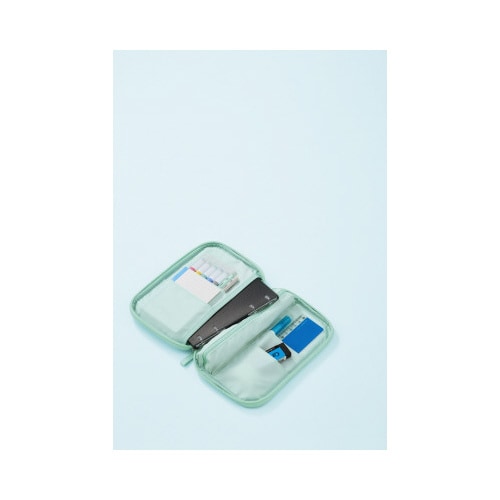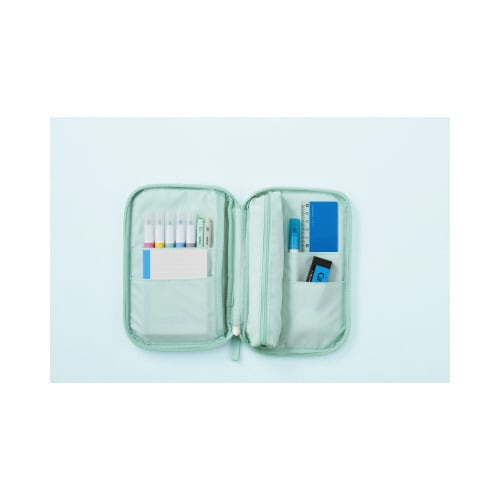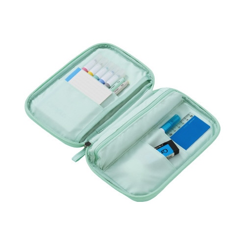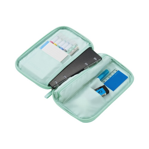 ノートのように開くので一覧性が良く、出し入れがしやすい。マルチポケットで文具やメモ帳をキレイに仕分けられる。持ち運びしやすいフラットな形状。A6サイズのノートやバインダーが入るポケット付き。 |