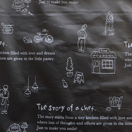 マチつきでたっぷり入る手提げバッグです。お菓子を作るシェフや店員さん、お店にお菓子のイラストがかわいく散りばめられたデザインです。何にでも合わせやすいので業種を問わずに使えます。