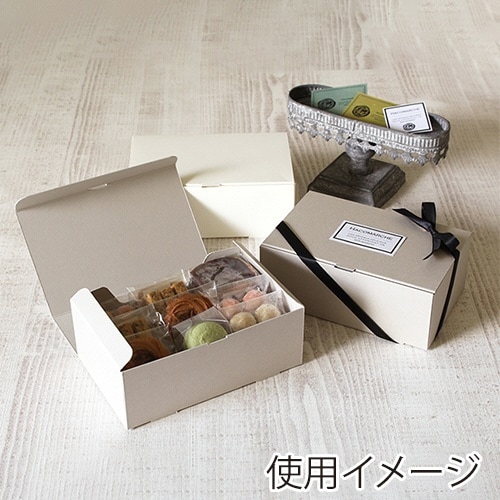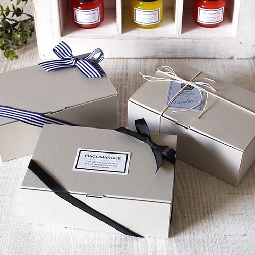 オススメカラーの「ミストグレー」のギフトボックスです。紙本来の肌触りとしっかりとした厚みがあり、控えめですが上品な印象の淡いグレーカラーが特徴です。焼き菓子や雑貨を詰め合わせてギフトセットに。 |