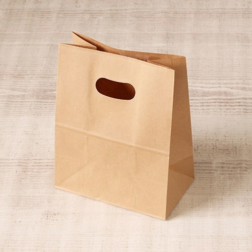 手穴のあいた、クラフトカラーの手提げ袋です。手穴の裏面にはフィルム貼りの補強加工が施してあり、持ち運びも安心です。お菓子などのお持ち帰り用にピッタリ。