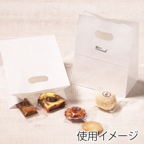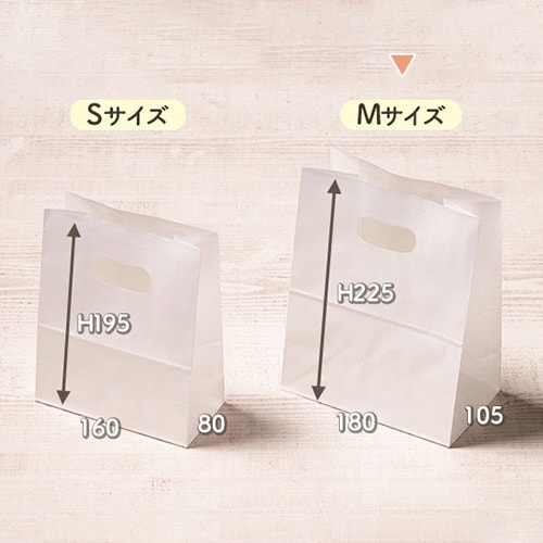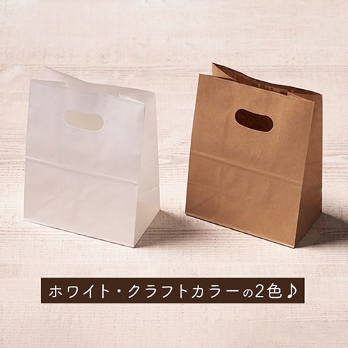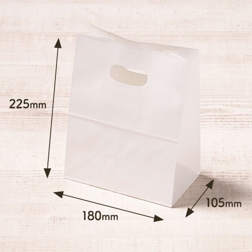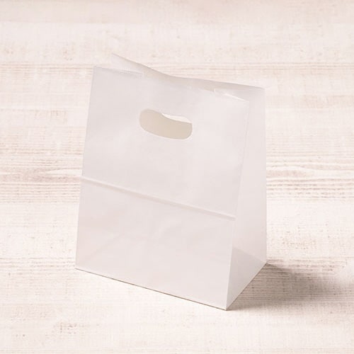 手穴のあいた、ホワイトカラーの手提げ袋です。手穴の裏面にはフィルム貼りの補強加工が施してあり、持ち運びも安心です。お菓子などのお持ち帰り用にピッタリ。