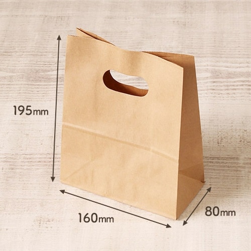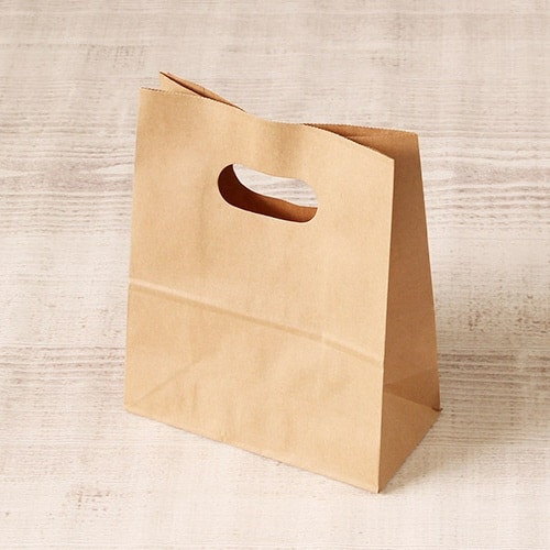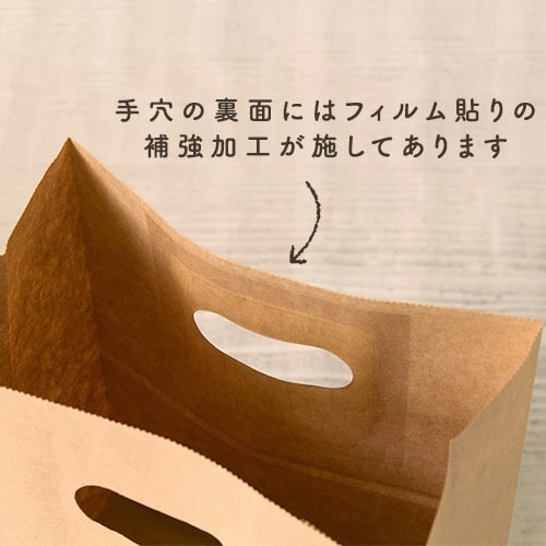 手穴のあいた、クラフトカラーの手提げ袋です。手穴の裏面にはフィルム貼りの補強加工が施してあり、持ち運びも安心です。お菓子などのお持ち帰り用にピッタリ。