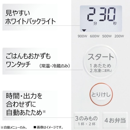 絶対湿度センサー搭載でスタートボタンワンタッチで自動あたためができます。レンジ出力最大900Wの高出力ですばやく温め可能。フラット庫内で大きなお弁当も出し入れしやすい。 |