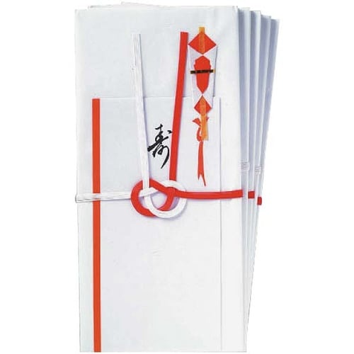 お祝いの回礼用で赤白5本水引。三つ折り半紙20枚入り。文字無し。1パック5個入。主に関西で使われます。 |
