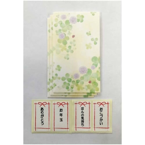 年中使える、お札三つ折りで入れるタイプの五型サイズのポチ袋3枚入り。表書きシール付(ほんの気持ち・おこづかい・ありがとう・お年玉)。 |