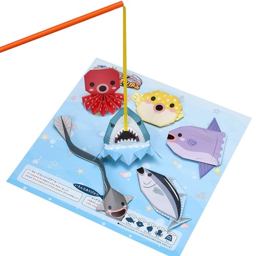 6種類のいきものとつりざお2つが作れます。フィッシングゲームシートに生きものをのせてつり上げてあそべます。 |