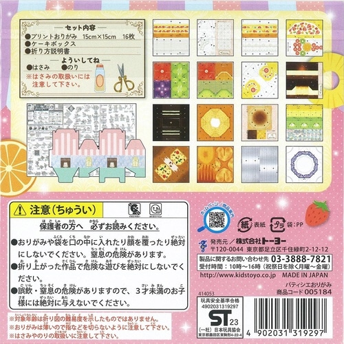 7つのケーキと3つの焼き菓子が作れるおりがみキット。トッピング用フルーツでオリジナルケーキがつくれます。ケーキボックス・トング・お皿も作れます。 |