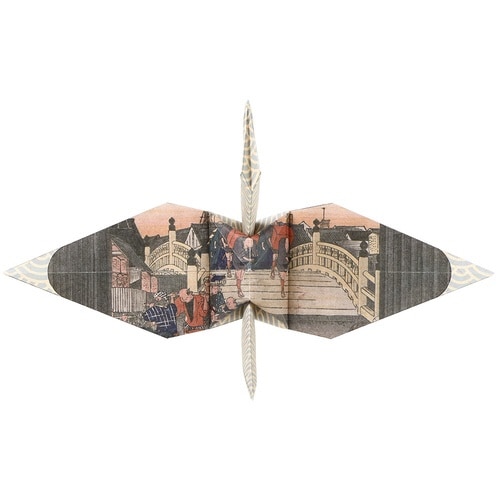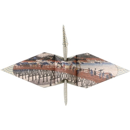江戸と京都を結ぶ東海道の53駅に、日本橋と京都三条大橋を加えた55図揃いの浮世絵をモチーフにした鶴が折れます。ユニバーサルデザイン折図入り。 |