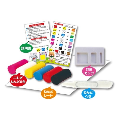 ねんど:6色(赤・ピンク・黄・青・白・黒)各1個、ねんどヘラ:1個、計量カップ:1個、ねんどシート:1枚、作り方テキスト:1枚