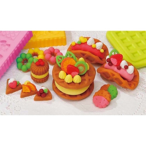 やわらかく色がきれいな安心素材のお米のねんどで作る、とってもかわいいお店屋さんねんど。型を使って、簡単にかわいいお店屋さんが作れます。