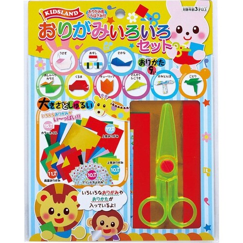 10cmから17.6cmサイズのいろいろなおりがみ、ハサミや折り方が入ったセット |
