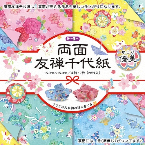 和柄でありながらメルヘン調のカワイイ千代紙です。裏面は表の千代紙の色味と同系色で柄はつけずにシンプルにしました。裏面が見える作品も、美しい仕上がりになります。 |
