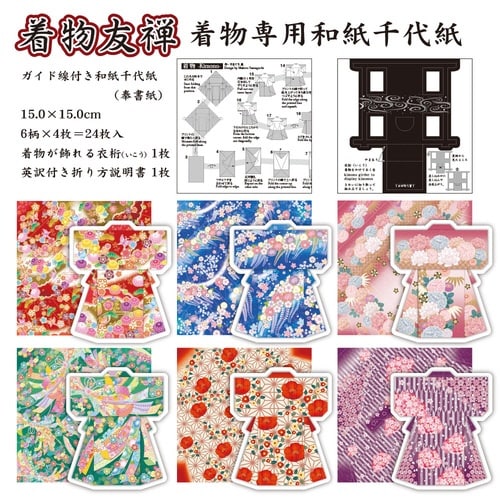 着物柄が美しく映える和紙千代紙。着物が飾れる衣桁(いこう)が作れます!折り上がった時に、着物の柄が綺麗に見えるようにデザインした和紙千代紙です。 |