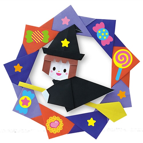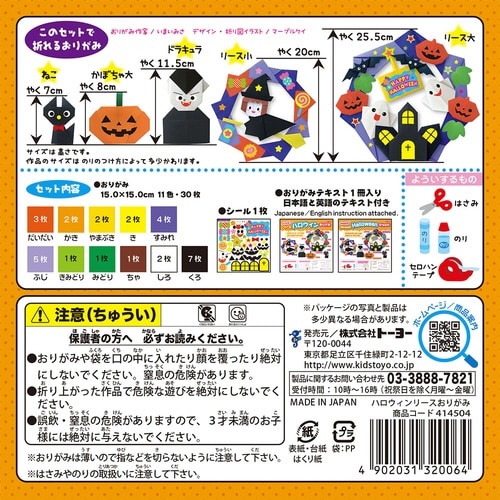 飾って楽しい。ハッピーハロウィンのリース飾りです。作品が5点(2種類のリースと3種類の作品)が作れます。たのしいシールです。英訳付きの折り方説明書付きです。 |