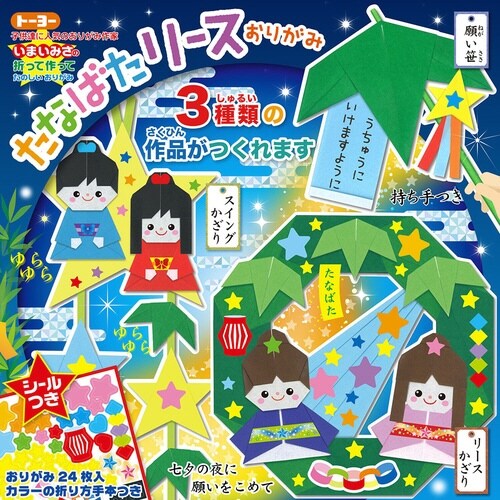 楽しい七夕用のお飾り商品です。3種類の飾りの折り方付き。 |