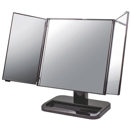 頭頂部も横顔も映す三面鏡。小物が置けるトレー付。 |