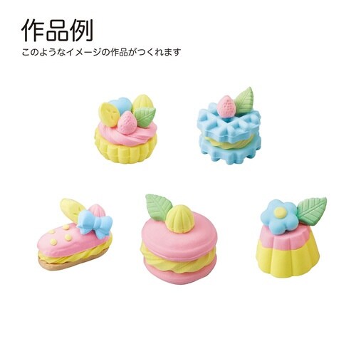 やわらかくて取り出しやすい立体ねんど型付。かわいい5種類のスイーツが作れる。パステル3色のねんど入。 |